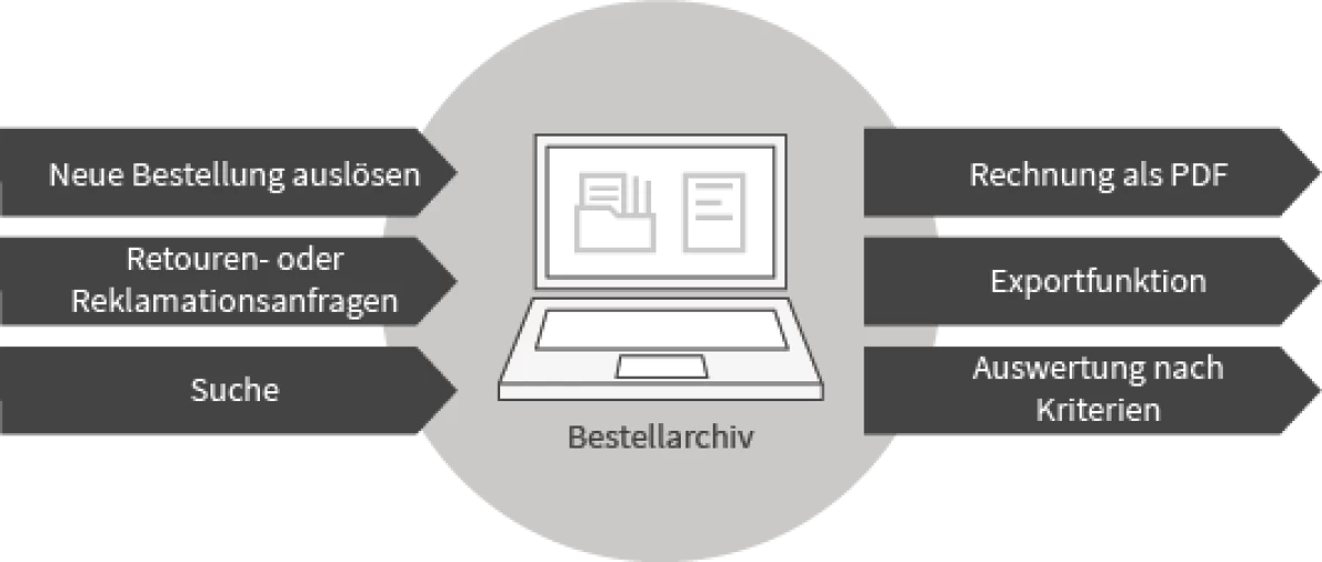 Abb. Bestellarchiv: Im Bestellarchiv sind alle getätigten Bestellungen tabellarisch aufgelistet. Durch einen Datenexport lassen sich Bestellungen nach bestimmten Kriterien auswerten.