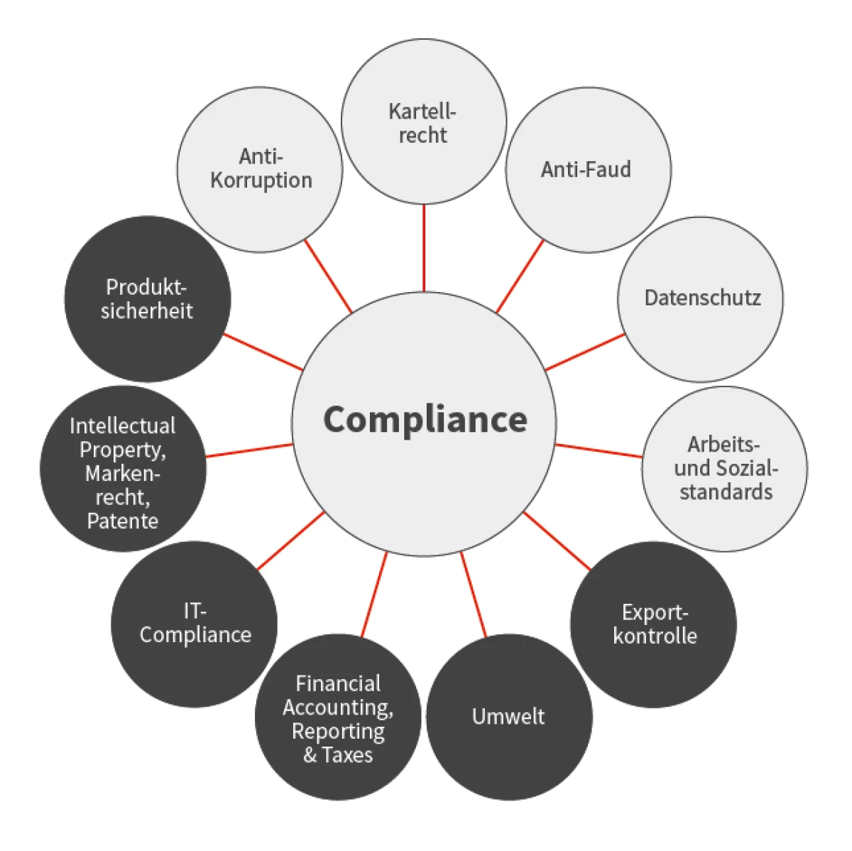 Abbildung: Wesentliche Compliance-Themen (hellgrau: werden oft von Compliance-Abteilungen betreut; dunkelgrau: werden von anderen Funktionen im Unternehmen betreut)