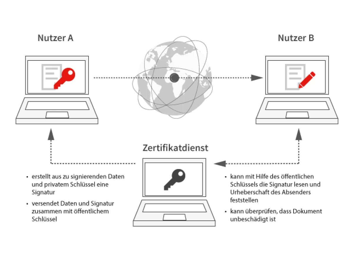Eine digitale Signatur ist ein asymmetrischer, elektronischer Schlüssel, mit dessen Hilfe die Identität eines Benutzers sichergestellt werden kann.