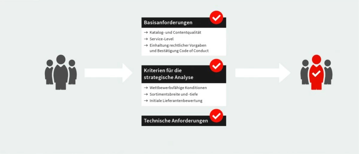 Bei der Auswahl von Lieferanten werden verschiedene, Kriterien beachtet, damit Kunden-Anforderungen an Sortiment, Konditionen, Content, Compliance, Datensicherheit, Nachhaltigkeit, Liefertreue und Service-Level gleichermaßen erfüllt werden. Bestenfalls steht der Marktplatzbetreiber dazu mit den Lieferanten in einem permanenten persönlichen Austausch und stellt im Rahmen einer strategischen Partnerschaft sicher, dass die Geschäftsbeziehung auch langfristig erfolgreich ist.