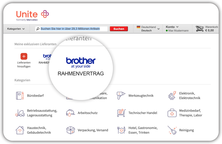 Um die Sonderkonditionen der Hersteller nutzen zu können, müssen Sie sich bei Unite einloggen. Mit Ihrer Anmeldung bestätigen Sie, bezugsberechtigt im Sinne Ihrer Brother-Rahmenvereinbarung zu sein. Die Konditionen Ihrer Rahmenvereinbarung werden für Sie erst nach erfolgreicher Anmeldung im linken Menü unter "Exklusive Kataloge" sichtbar.
