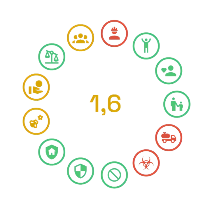 Beispiel rechts: Der Lieferant erreicht eine Gesamtbewertung von 1,6. Außerdem wird die individuelle Risikoexposition in den 13 Kategorien des LkSG dargestellt.