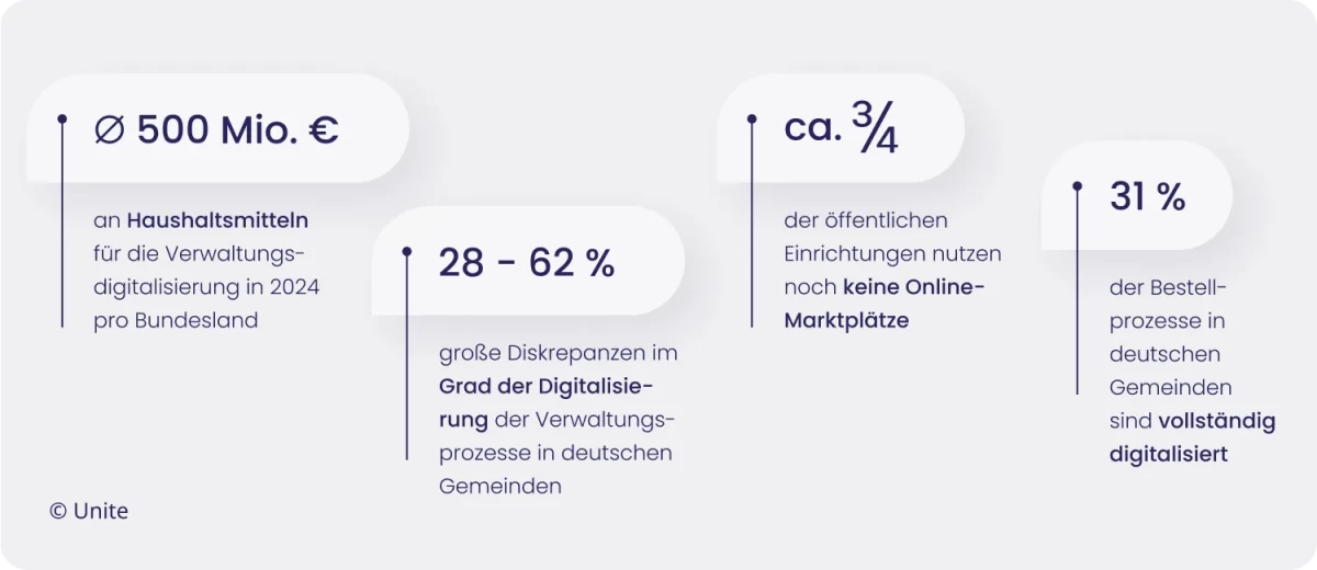 Die Bundesländer stellten im Jahr 2024 durchschnittlich eine halbe Milliarde an Haushaltsmitteln für die Verwaltungsdigitalisierung bereit. In einigen Regionen wurden sogar über 200 Euro pro Kopf investiert (Bitkom). Trotz der Investitionen verläuft die Digitalisierung der Städte und Gemeinden nicht einheitlich. Während in Hamburg, Nordrhein-Westfalen und Bremen schon mehr als die Hälfte aller Verwaltungsprozesse digitalisiert sind, liegt der Digitalisierungsgrad in Thüringen und Brandenburg noch unter einem Drittel. Für mehr Transparenz in der öffentlichen Beschaffung braucht es modernere Technik, eine leistungsfähigere Verwaltungsinfrastruktur und innovative Beschaffungslösungen (Bitkom). Auch in vielen Bereichen der öffentlichen Beschaffung ist die Digitalisierung noch nicht angekommen. Besonders groß ist der Rückstand bei der tatsächlichen Bestellung. Hier sind gerade einmal 31 Prozent vollständig digitalisiert (Wegweiser Media).