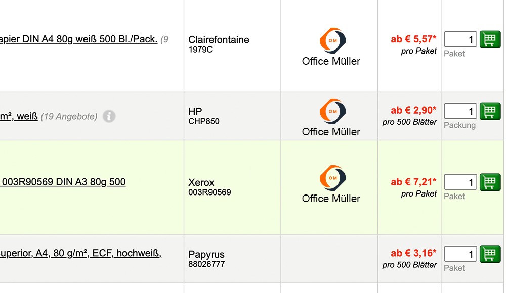 Die katalogübergreifende Suche bezieht sowohl das Marktplatz-Sortiment als auch Ihre Rahmenvertragskataloge in das Suchergebnis mit ein. Durch das Logo Ihres Lieferanten erkennen Sie dessen Produkte sofort. Mit einem Klick werden alle Kataloge durchsucht und die Konditionen gegenübergestellt. Sie erhalten so einen automatischen Angebotsvergleich.