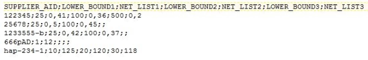 SUPPLIER_AID is mandatory information, all further columns can be used as required. A conditions file with price information is shown in the following example: