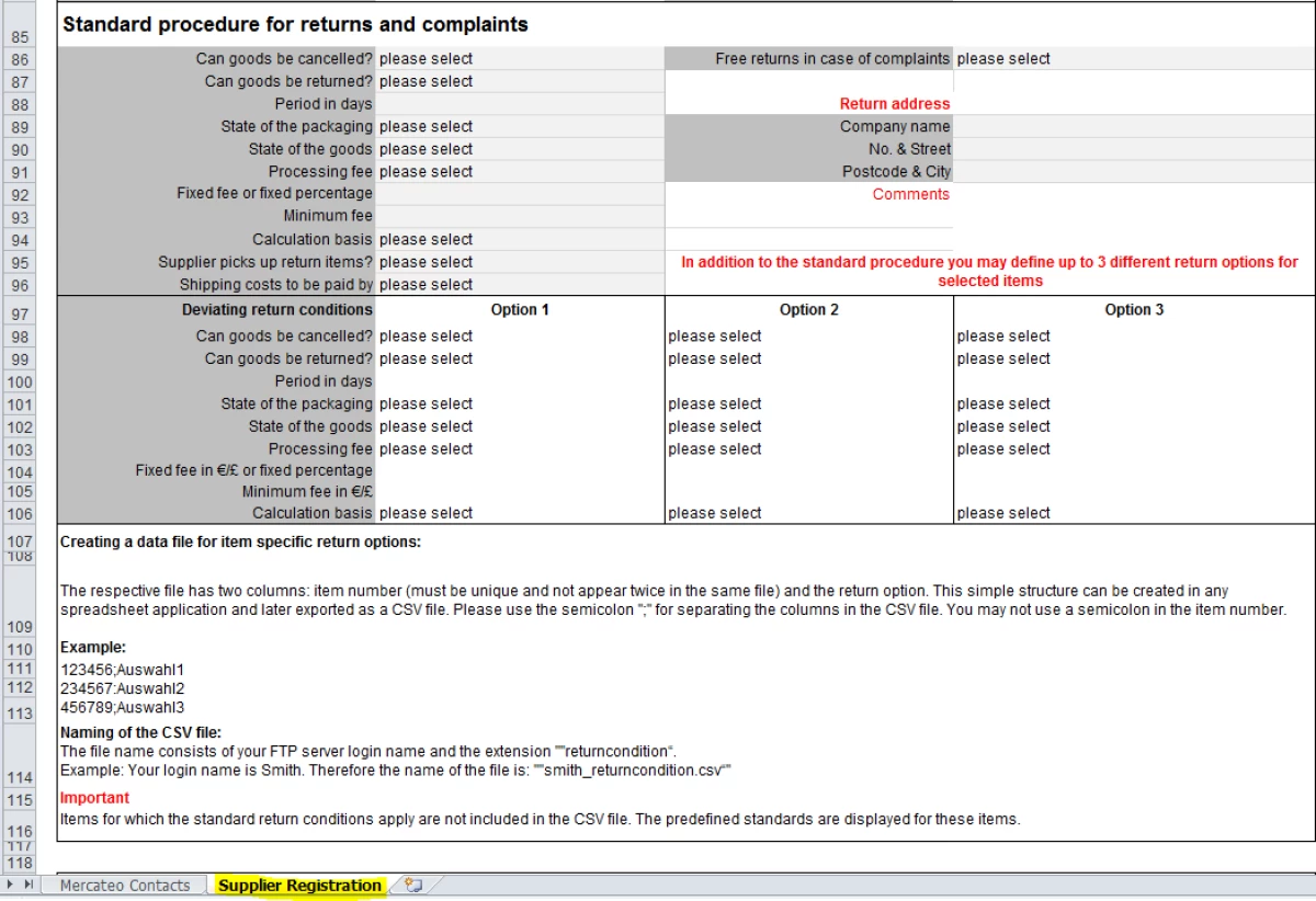 Please first contact your supplier supervisor at Mercateo. He will send you a supplier master data sheet (SDS) in the form of an Excel table. You must send this back completed. Please ensure that all information regarding returns conditions is correct and complete.