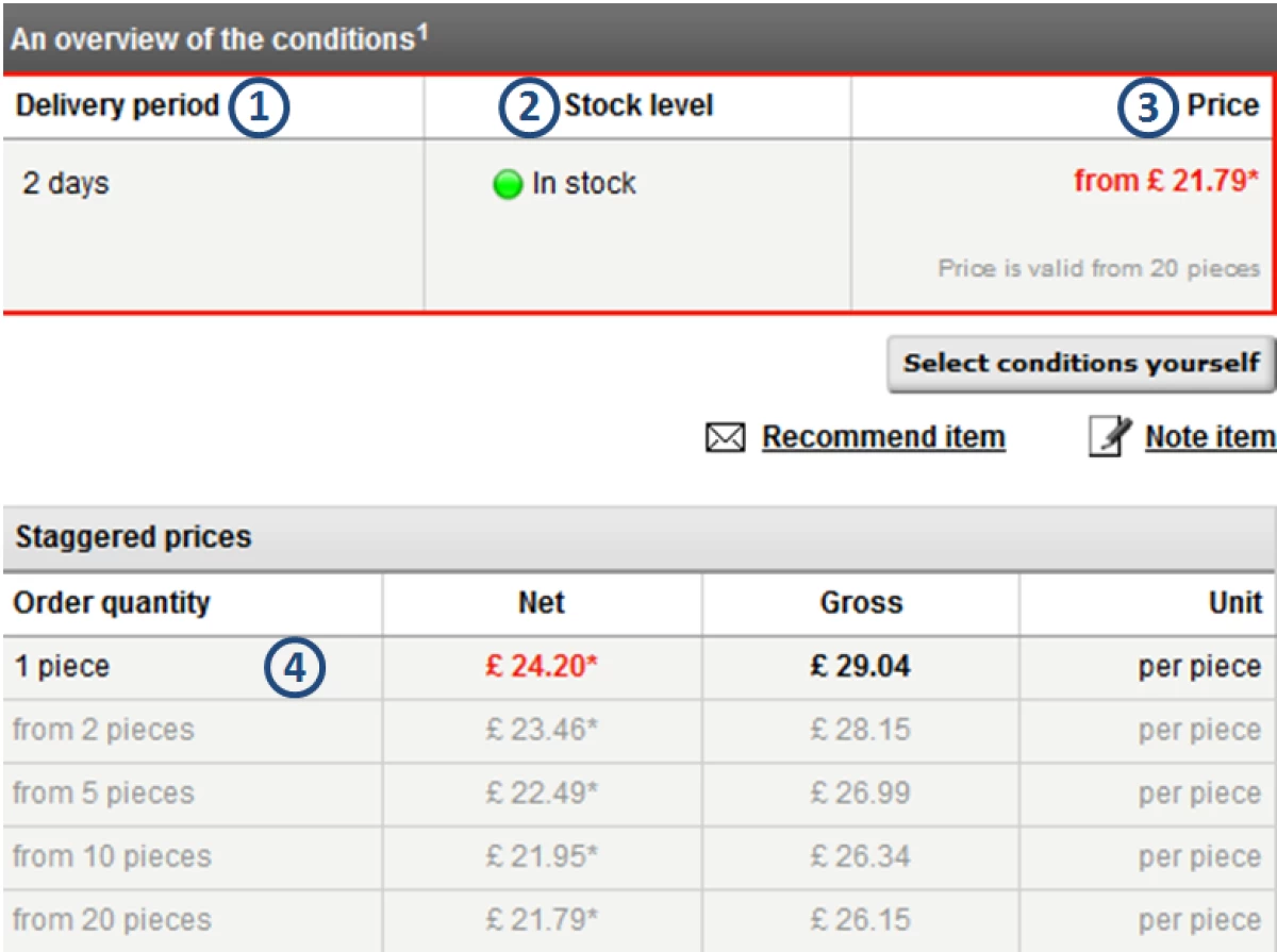The conditions are shown on the right-hand side of the product detail page. The display varies depending on whether you have the conditions suggested to you (simple presentation) or you select conditions yourself (expanded presentation).