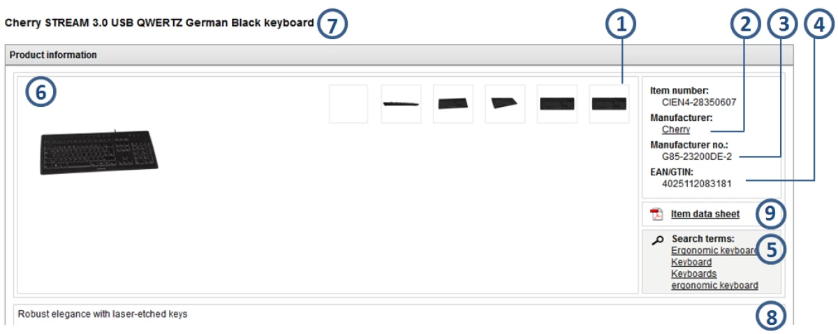 Product information such as item name, EAN, manufacturer information and search terms is shown on the left-hand side of the product detail page. The following illustration offers an overview of which BMEcat element can be accessed in each case.