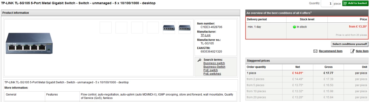 The product information and conditions from the catalogue are shown on the product detail page.