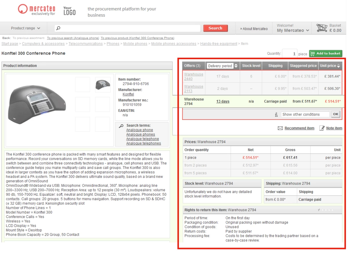 In order to offer the widest possible product range, Mercateo uses several specialised warehouses. Therefore, items sometimes appear in multiple warehouses and with different conditions (such as price, delivery time, shipping costs, minimum order quantity and return policies).