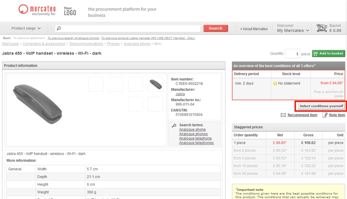 All items have a product detail page with a detailed description. This usually includes: content information as product number, brand, manufacturer no., EAN, images, product features, and product data sheets, as well as conditions, e.g. delivery time, stock level and staggered prices. By clicking on the right “Select conditions yourself” you can see details such as shipping costs and return policies.