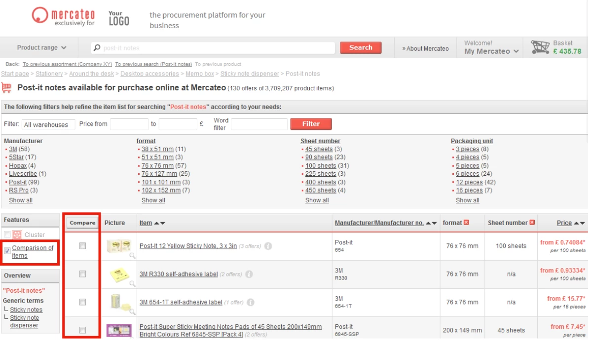 On the search results page, you can refine your search using search filters based on brand and relevant properties. Filters can be combined with each other, e.g. search for copy paper A3 and A4 from Xerox with a certain colour. Search results can also be limited by entering a price range, such as copy paper from £ 10 to £ 25. You can also add an additional keyword, such as ‘ecology’.