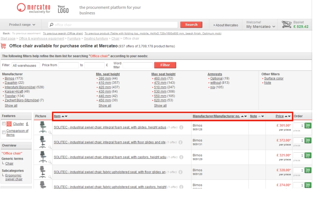Use the free purchasing function ‘Mercateo Cluster’ to bundle several items with the same selected properties (e.g. Copy paper, A3, 80 g / m², white). Thereby, you can increase the possibilities to optimize the shopping basket.
