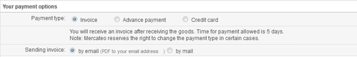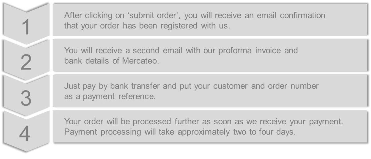 Note – Mercateo reserves the right to reject payment on account/invoice. This will be determined with each order and depends on a number of factors. Should payment on account not be possible, you will receive an email with a proforma invoice for advance payment.
