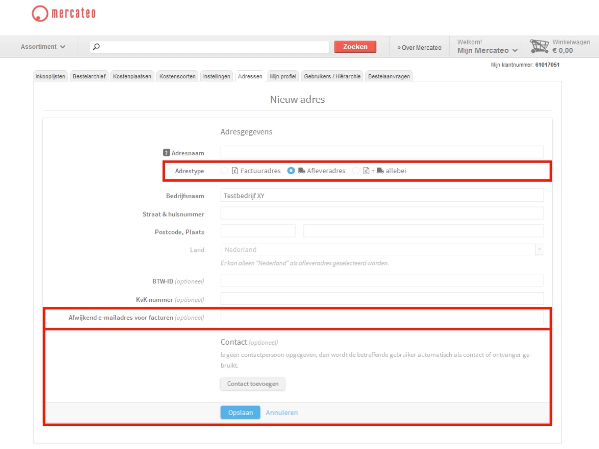 Adding/changing addresses - If you are the administrator of the company account, or if you have been authorised to do so, you can create and change invoice and delivery addresses. To add a new address, log on to My Mercateo, go to the tab 'Addresses' and click 'New address'.