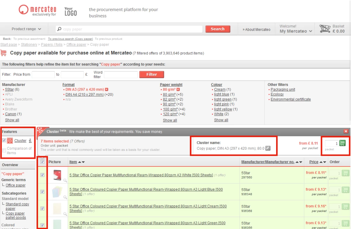 Use the free purchasing functionality Unite Cluster to bundle several items with the same selected properties (e.g. Copy paper, A3, 80 g / m², white). Thereby, you can increase the combination possibilities to optimise your shopping basket.