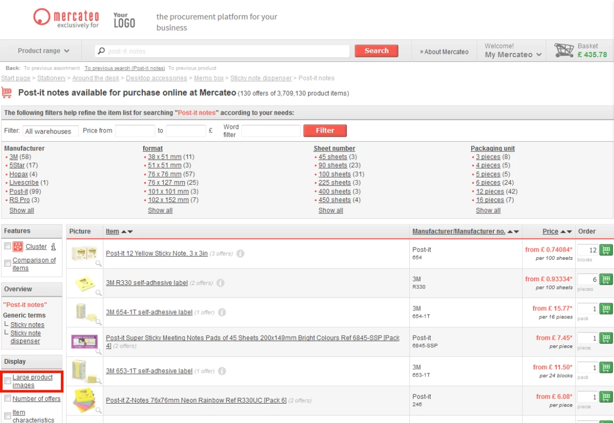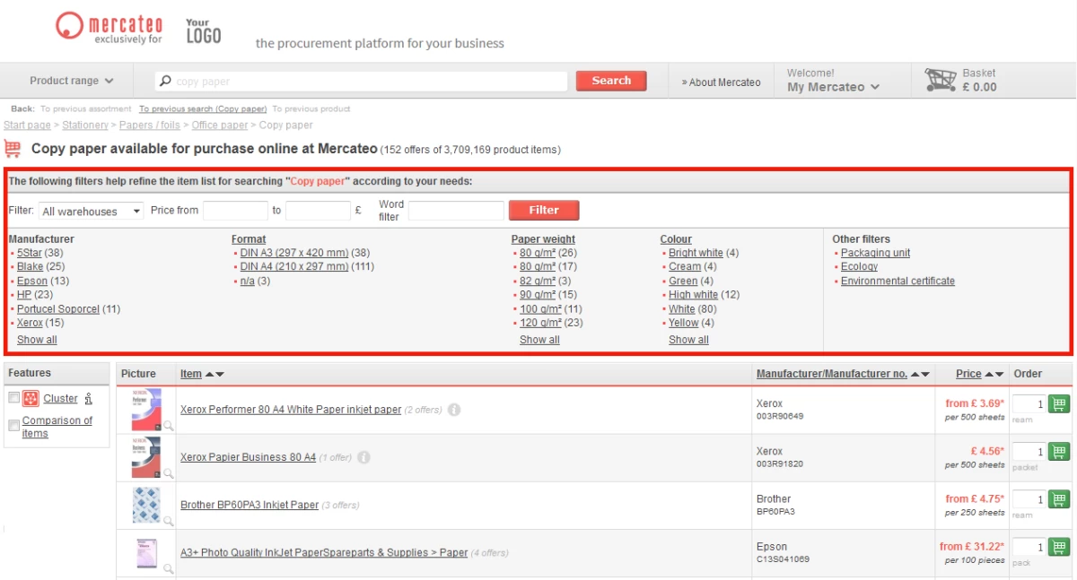 On the search results page, you can refine your search using search filters based on brand and relevant properties. Filters can be combined with each other, e.g. search for copy paper A3 and A4 from Xerox with a certain colour. Search results can also be limited by entering a price range, such as copy paper from £ 10 to £ 25. You can also add an additional keyword, such as 'ecology'.