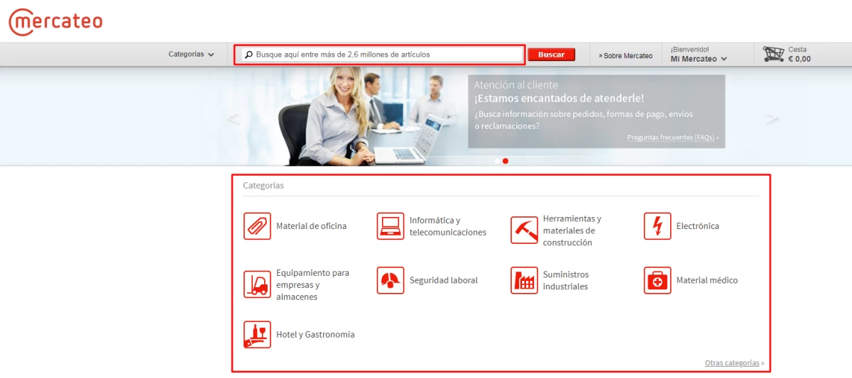 Si utiliza el buscador, introduzca el término que desea encontrar. Puede utilizar un nombre de producto, una palabra clave, una marca, el número de fabricante o el código EAN. También puede buscar directamente por categorías y subcategorías para encontrar el producto que necesite. Para ello, simplemente haga clic en el icono de la categoría del producto hasta encontrar el artículo que más se adapte a sus necesidades.