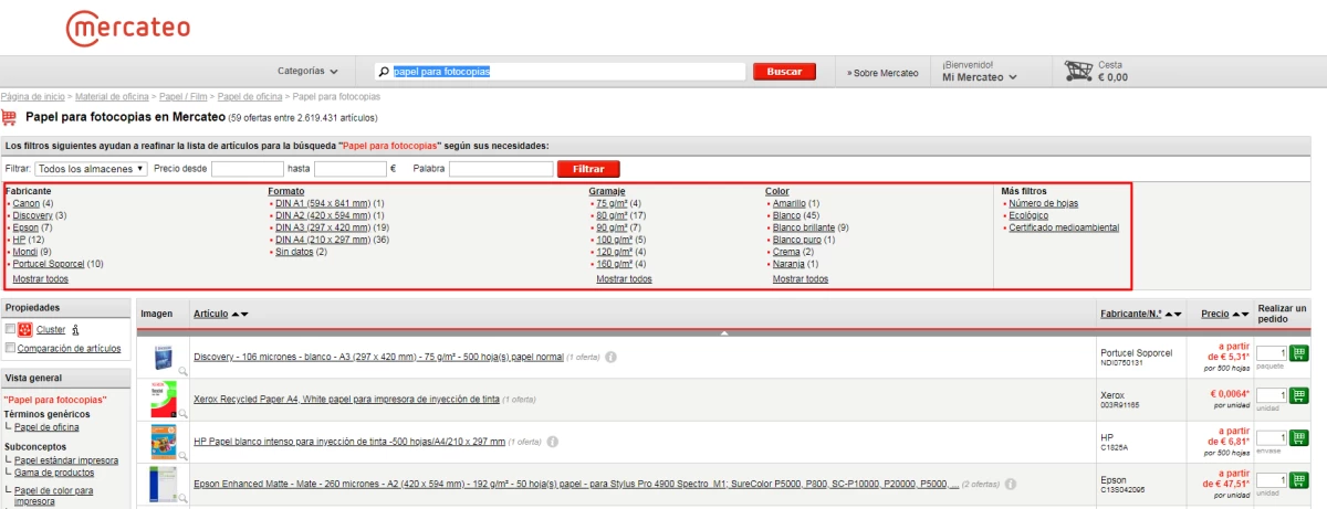En la página de resultados de búsqueda, puede limitar sus resultados por marca o por propiedades de producto. También puede combinar varios filtros al mismo tiempo. Por ejmplo, puede buscar papel de impresora A3 y A4 de Xerox y seleccionar un color específico. Se pueden delimitar también los resultados de búsqueda introduciendo un rango de precio o una característica especial. Ejemplo: papel de impresora desde 10€ hasta 25€ y como característica adicional “papel ecológico”.