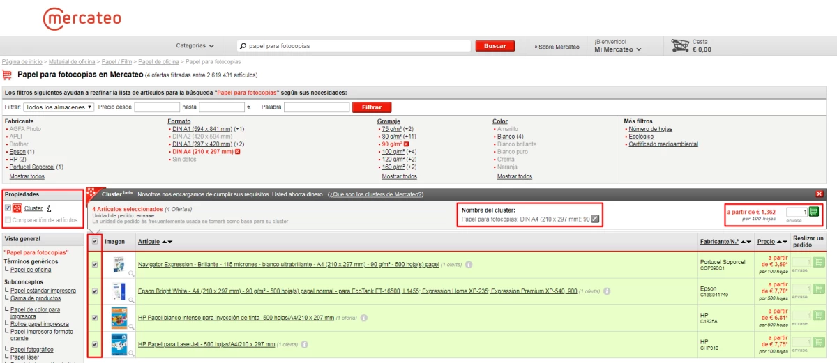 Utilice la funcíon gratuita “Mercateo Cluster” que le permitirá agrupar varios artículos con propiedades similares (ej. Papel para fotocopias, A3, 80 g / m², blanco). De esta manera, podrá optimizar al máximo su cesta .Para usar Mercateo Cluster, vaya a la página de resultados de búsqueda, en la parte izquierda encontrará la sección “Propiedades” y active la casilla “Cluster”. Utilice los filtros de búsqueda en la parte superior de la página para afinar la búsqueda o introduzca un término específico en el buscador. Después, seleccione todos los artículos que cumplan con sus requisitos. Puede asignar un nombre al “Cluster” haciendo clic en el icono gris “Nombre del Cluster”. Haciendo clic en el icono de la cesta puede añadir el “Cluster” completo en la cesta. Mercateo calcula así de forma automática la mejor combinación posible entre precio, tiempo de envío y menor número de entregas.
