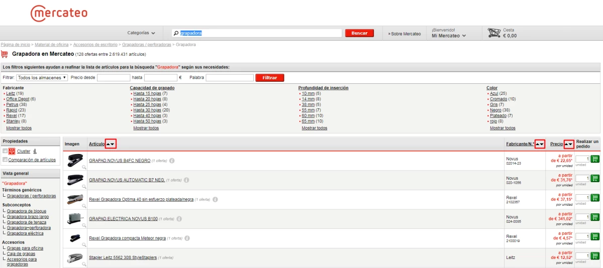 Al realizar una búsqueda en Mercateo, los resultados se ordenan automáticamente situando las mejores opciones al principio. Puede utilizar las flechas que aparecen junto al nombre del artículo, fabricante o precio para clasificar sus resultados en orden ascendente o descendente. El número de artículos que aparecen en los resultados de búsqueda no cambiará.