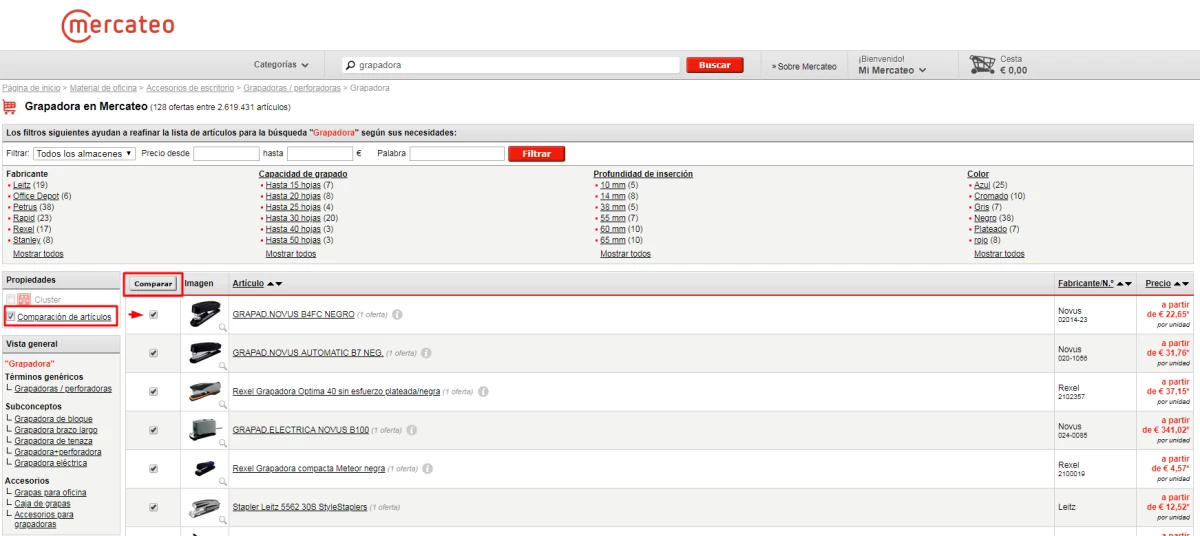 Se pueden comparar artículos en los resultados de búsqueda. Vaya al cuadro de la izquierda “Visualización”. Seleccione los artículos deseados y haga clic en la parte superior “Comparar”. Se le redirigirá a una página que muestra una comparación de los artículos seleccionados.
