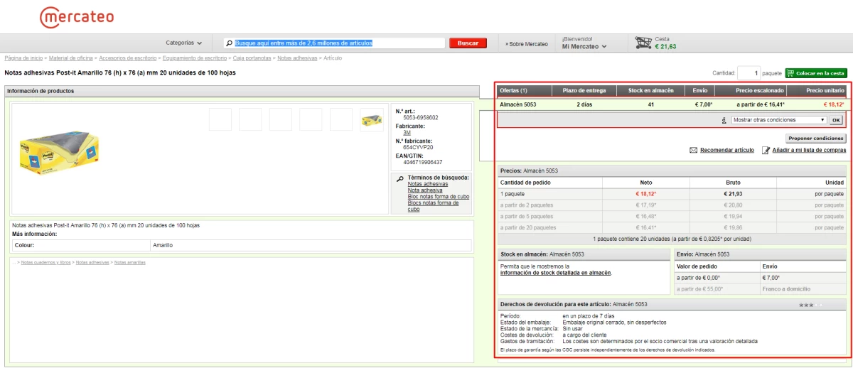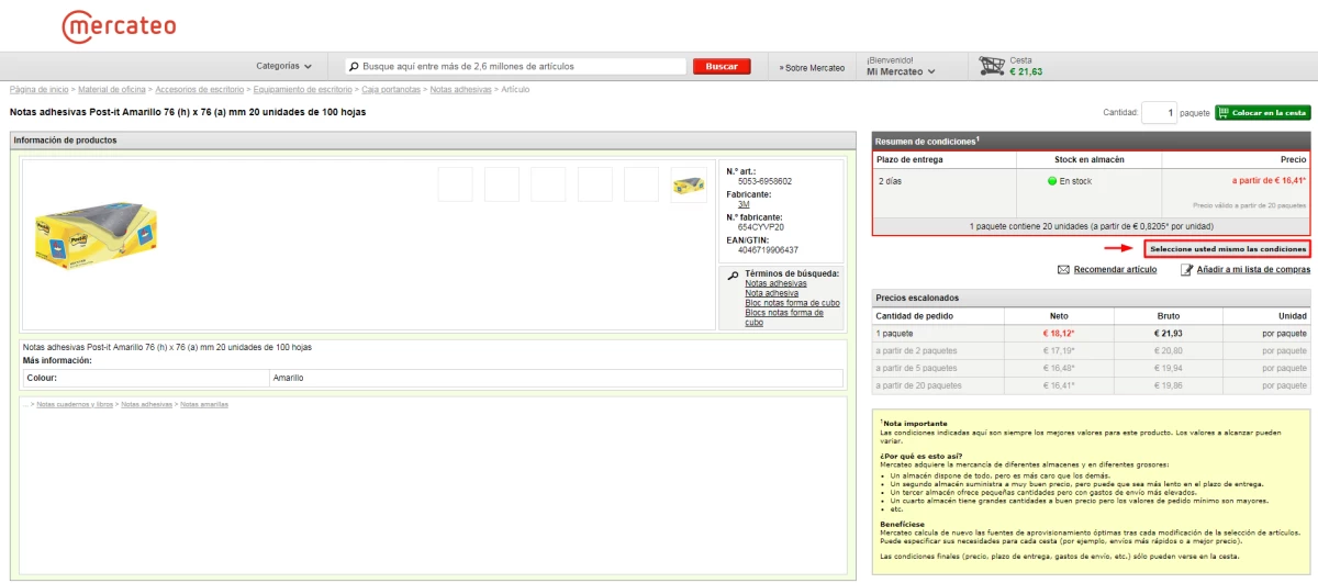 Todos los artículos tienen una página de producto con una descripción detallada. La descripción incluye: información de contenido (número de producto, marca, número de fabricante, EAN, imágenes, características del producto) y hojas de datos del producto. También se especifican las condiciones: plazo de entrega, nivel de stock y precios escalonados. Haciendo clic en el botón derecho “Seleccione usted mismo las condiciones” podrá ver otros detalles como los gastos de envío y la política de devolución.