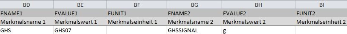 Si se utilizan las plantillas de Excel, el etiquetado de materiales peligrosos sólo se puede introducir como una característica. Para ello, utilice las columnas, empezando por la columna BD.
