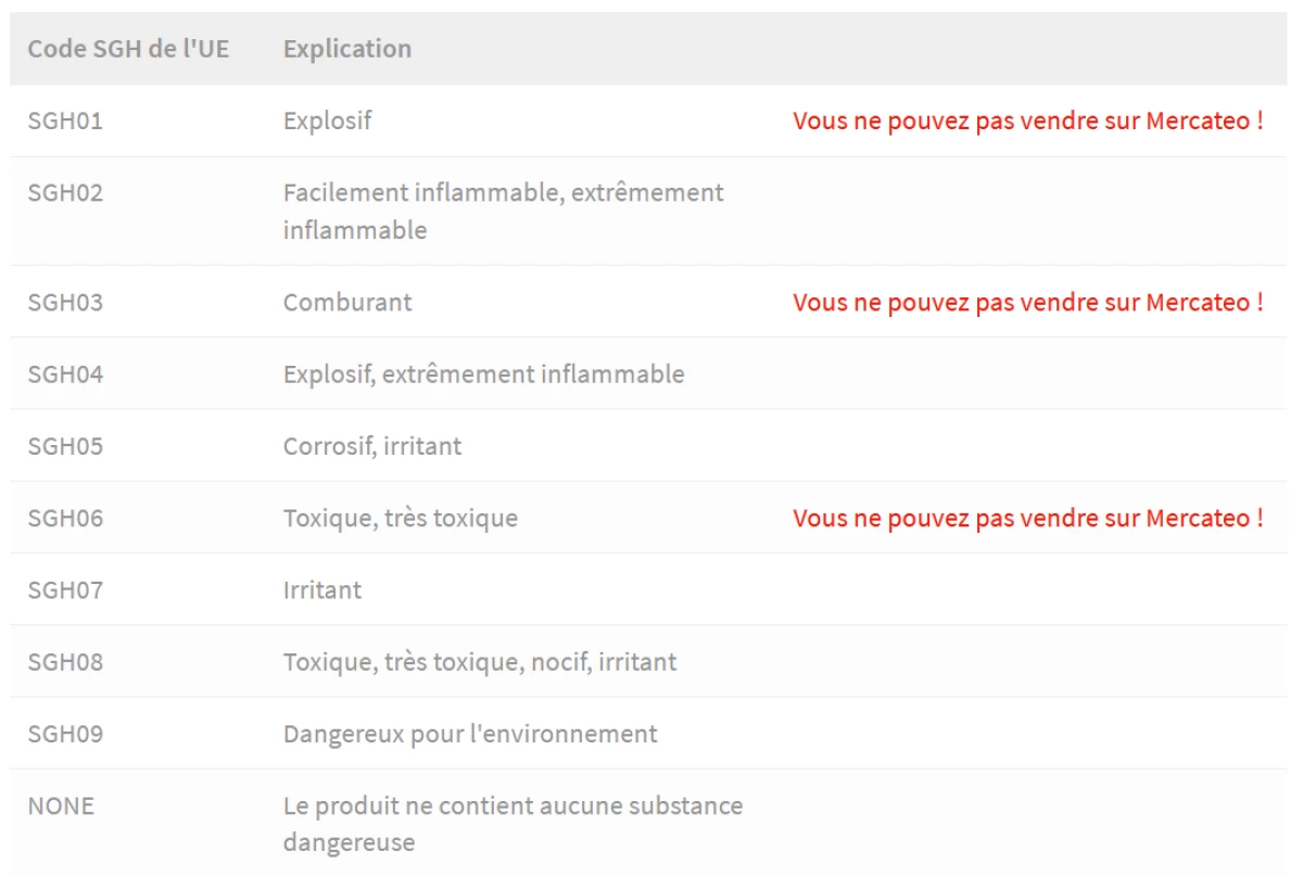 Si les produits contiennent des substances dangereuses, vous devez les marquer avec les codes SGH de l'UE ci-dessous :