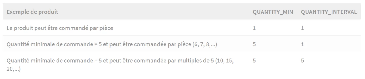Pour QUANTITY_INTERVAL, entrez le multiple par lequel les produits peuvent être commandés à partir de la quantité minimale de commande.