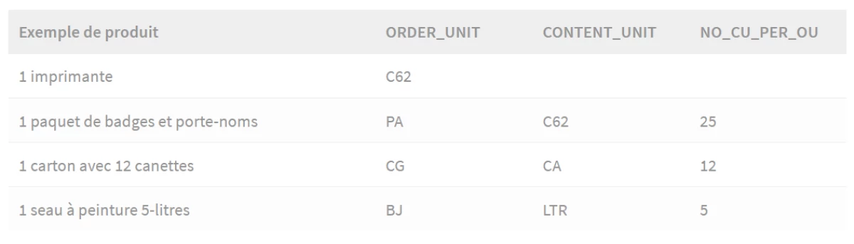 ATTENTION : Pour représenter un achat à l'unité, veuillez laisser les colonnes CONTENT_UNIT et NO_CU_PER_OU vides.
