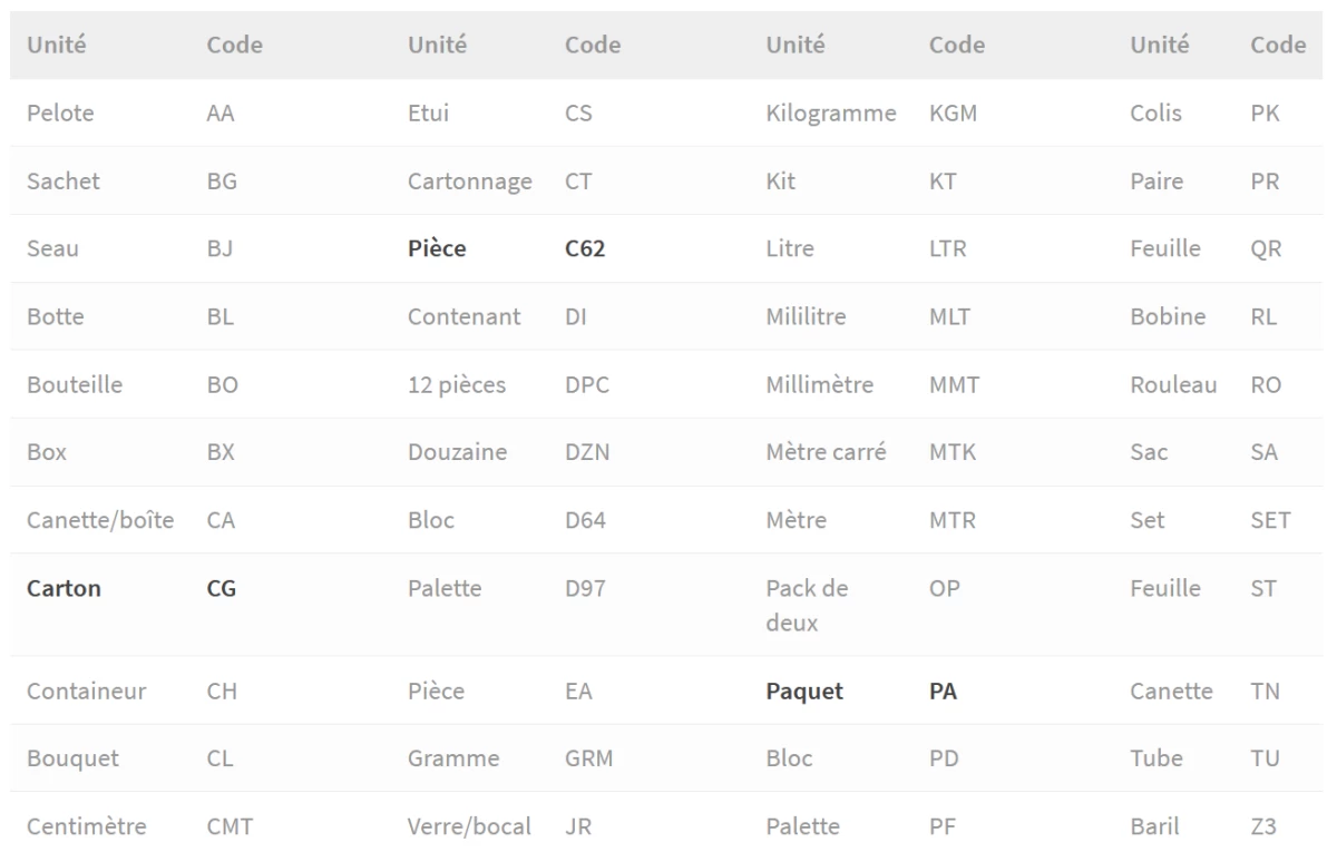 L'unité de commande et l'unité de contenu sont toujours indiquées sous forme de code UNCEFACT :