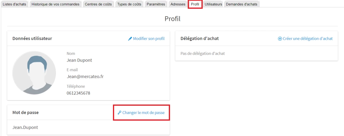 Profil - Votre profil se compose de votre nom, adresse e-mail et numéro de téléphone. Ici, vous pouvez modifier votre profil, changer votre mot de passe et choisir qui vous remplacera pour recevoir et répondre aux demandes d'achats en cas d'absence grâce à la délégation d'achat.
