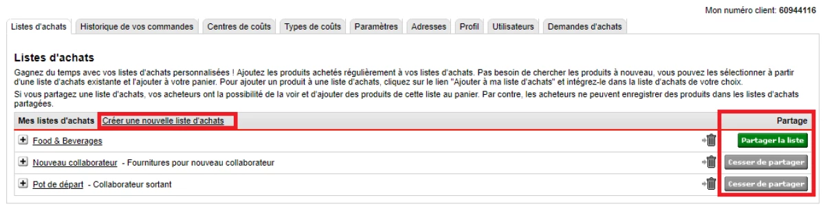 Listes d'achats - Ici, vous pouvez créer, modifier et supprimer des listes d'achats. Les listes d'achats sont utiles pour les articles que vous achetez régulièrement. Ainsi, lors de votre prochaine visite chez Mercateo, vous n'aurez plus besoin de rechercher à nouveau les articles, mais vous pourrez simplement les commander à partir de votre liste d'achats. Si votre entreprise utilise une hiérarchie d'achats et que vous êtes l'administrateur principal du compte d'entreprise, vous pouvez également autoriser vos listes d'achats pour tous les autres utilisateurs de la hiérarchie d'achats.
