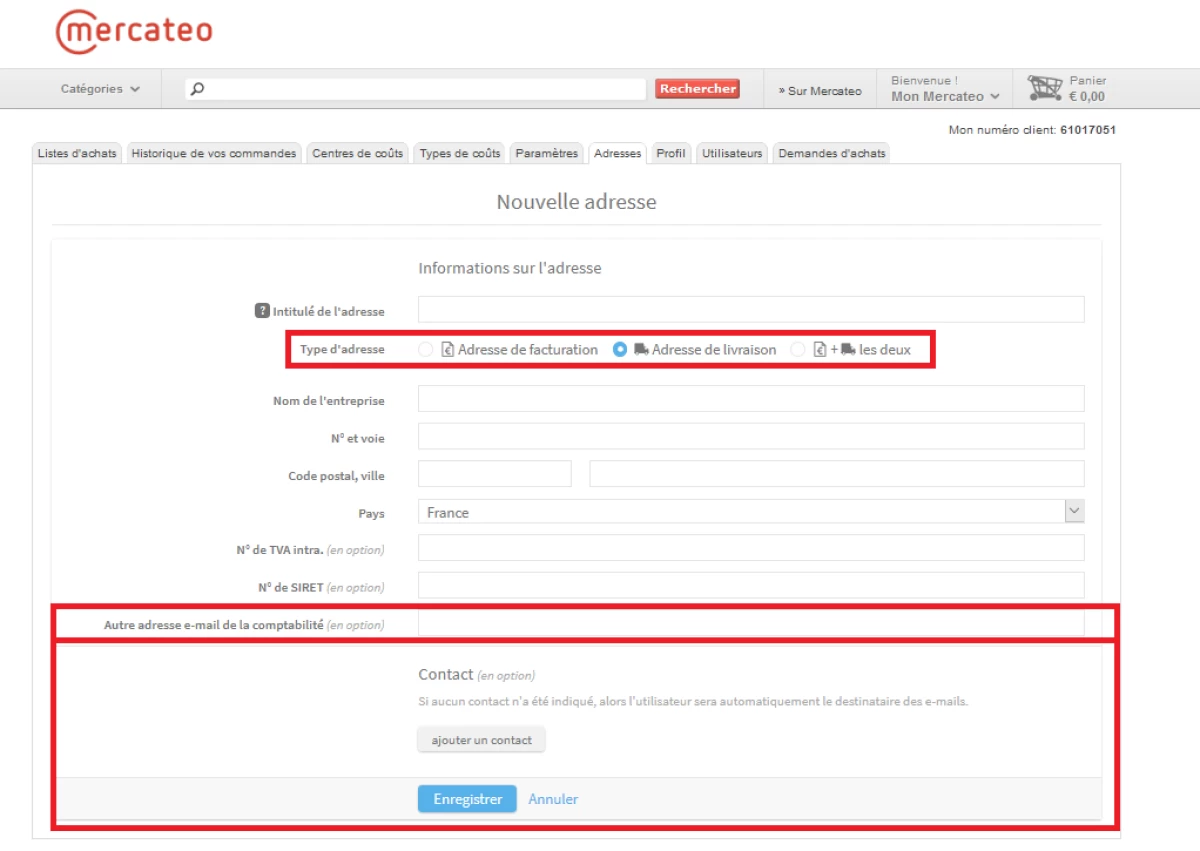 Créer un compte - Seuls les clients professionnels peuvent commander sur Mercateo : entreprises privées, autoentrepreneurs, établissements publics, associations … Pour créer un compte, rendez-vous sur www.mercateo.fr, cliquez sur "Mon Mercateo" puis "Créer un compte". Vous serez automatiquement redirigé vers la page d’inscription. Remplissez tous les champs obligatoires et cliquez à nouveau sur "S’enregistrer maintenant". Après quelques minutes, vous recevrez un e-mail de confirmation avec votre numéro de client.