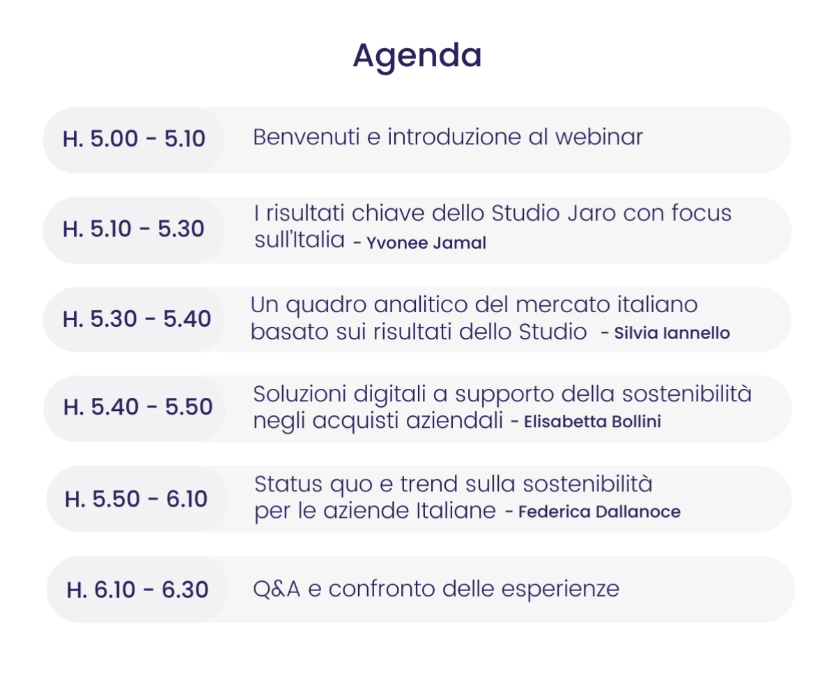 Il 14 marzo 2024 presenteremo i risultati della ricerca, con focus particolare sullo stato attuale della sostenibilità negli acquisti aziendali in Italia e condivideremo alcuni consigli per acquisti più responsabili e sostenibili.