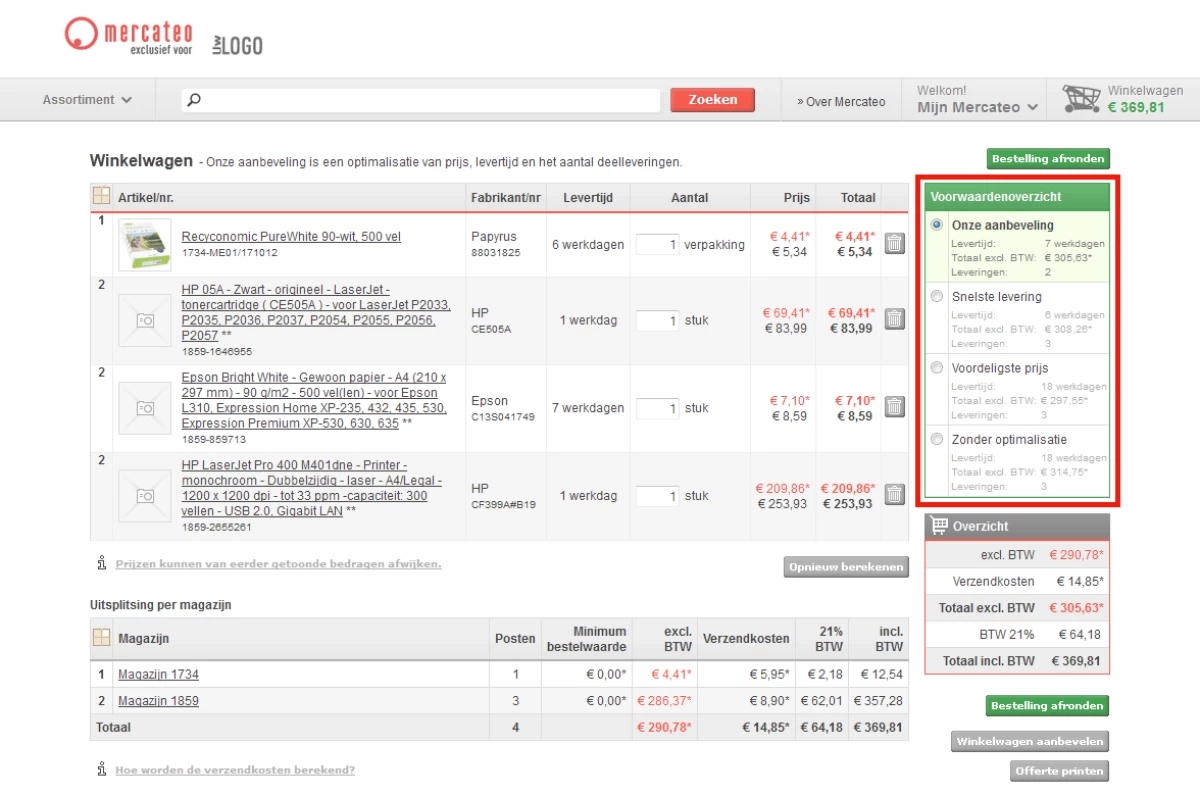 Mercateo maakt gebruik van verschillende gespecialiseerde magazijnen om het grote aantal uiteenlopende producten te kunnen leveren. Heeft u meer dan één artikel aan uw winkelwagen toegevoegd dan berekent Mercateo automatisch de beste combinatie van prijs, levertijd en het aantal deelleveringen. Zo kan het bijvoorbeeld zijn dat het artikel dat u oorspronkelijk gekozen heeft ook beschikbaar is in een ander magazijn, waardoor de totaalprijs en levertijd afneemt, maar het aantal deelleveringen toeneemt. Dit is de winkelwagen optimalisatie. In het voorwaardenoverzicht wordt het resultaat van de optimalisatie weergegeven als 'Onze aanbeveling’.