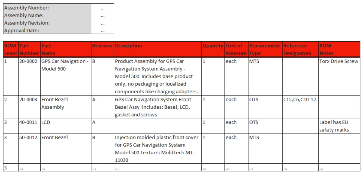 De lijst van materialen van een fiets bestaat bijvoorbeeld uit het frame, een stuur, de wielen, de remmen, de aandrijving, het zadel, de accessoires, … enz. Er zit een bepaalde structuur in, omdat een onderdeel ook weer uit andere onderdelen kan bestaan. Neem bijvoorbeeld een laptop. Op het hoogste niveau staat de doos waarin het samen met de handleiding verpakt is. De lijst van materialen van de laptop zelf heeft dan artikelen als moederbord, toetsenbord, beeldscherm, software. En ook deze kunnen weer een eigen lijst van materialen hebben. Op het laagste niveau staan de artikelen die ingekocht worden. Het kan bijvoorbeeld zijn dat de toetsenborden in hun geheel worden ingekocht. De leverancier hiervan zal dan ook een bill of materials hebben voor dit toetsenbord, maar die is niet van belang voor de fabrikant van de laptop.