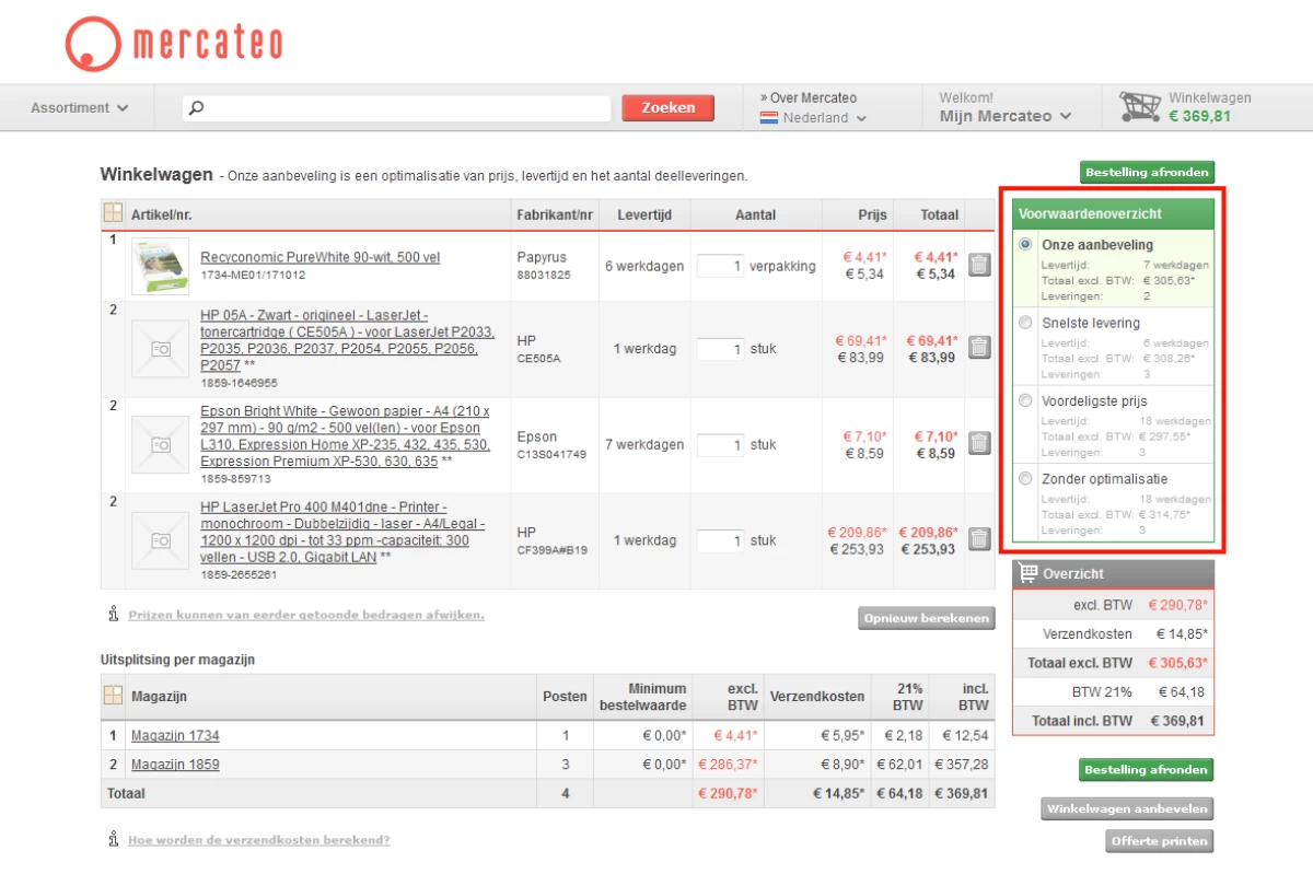 Mercateo maakt gebruik van verschillende gespecialiseerde magazijnen om het grote aantal uiteenlopende producten te kunnen leveren. Heeft u meer dan één artikel aan uw winkelwagen toegevoegd dan berekent Mercateo automatisch de beste combinatie van prijs, levertijd en het aantal deelleveringen. Zo kan het bijvoorbeeld zijn dat het artikel dat u oorspronkelijk gekozen heeft ook beschikbaar is in een ander magazijn, waardoor de totaalprijs en levertijd afneemt, maar het aantal deelleveringen toeneemt. Dit is de winkelwagen optimalisatie. In het voorwaardenoverzicht wordt het resultaat van de optimalisatie weergegeven als 'Onze aanbeveling’.